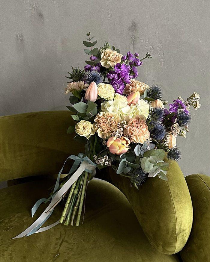 Букет из микса пастельных цветов — нежное и уникальное решение для подарка близкому человеку.